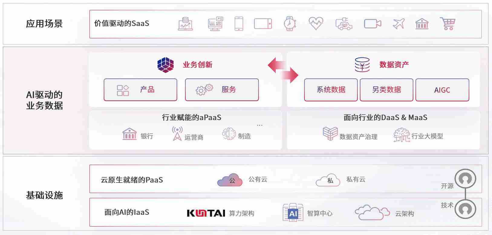 数字时代,,,围绕企业数字化转型的关键要素,,,,PA旗舰厅数码开创性的提出数云融合战略和技术体系框架,,,,着力在云原生、、数字原生、、AI原生和信创产业上架构产品和服务能力,,,为处在不同数字化转型阶段的快消零售、、、、汽车、、、金融、、、医疗、、政企、、、教育、、运营商等行业客户提供泛在的敏捷IT能力和融合的数据驱动能力,,,,构建跨界融合创新的数字业务场景和新业务模式,,,,助力企业级客户建立面向未来的核心能力和竞争优势,,,,全面推动社会的数字化、、、、智能化转型升级。。。
